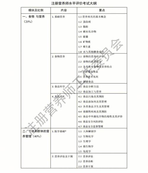 1. 理论知识:这部分考试时间为90分钟,题型包括选择题和判断题,总共100题。内容涵盖职业道德、医学基础、营养学基础、食物营养基础、膳食指导等。