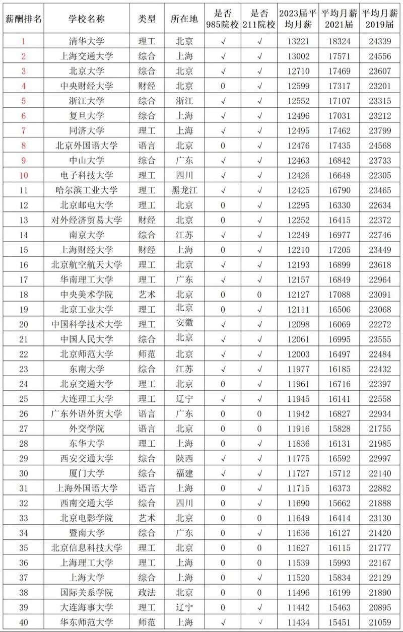 1. 清华大学以平均月薪13221元位居榜首。
