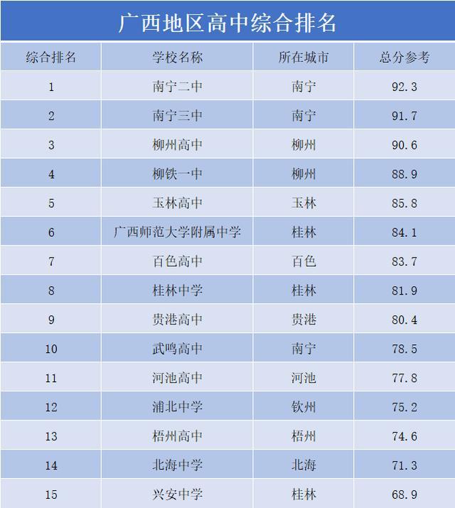 1. 广西柳州高级中学:位于柳州市,是广西壮族自治区示范性普通高中,也是广西壮族自治区文明单位、全国教育系统先进集体。