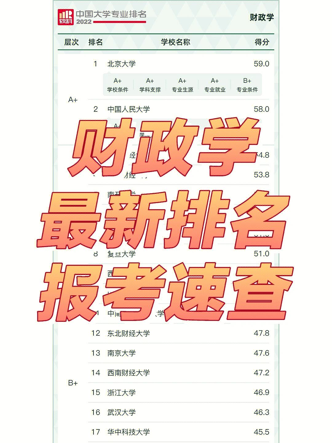 4. 专业排名:在2023年软科中国大学专业排名中,财政学专业最好的大学是北京大学,财政学专业排名前十的大学包括中国人民大学、复旦大学、中央财经大学等,显示了该专业在高等教育中的重要地位。