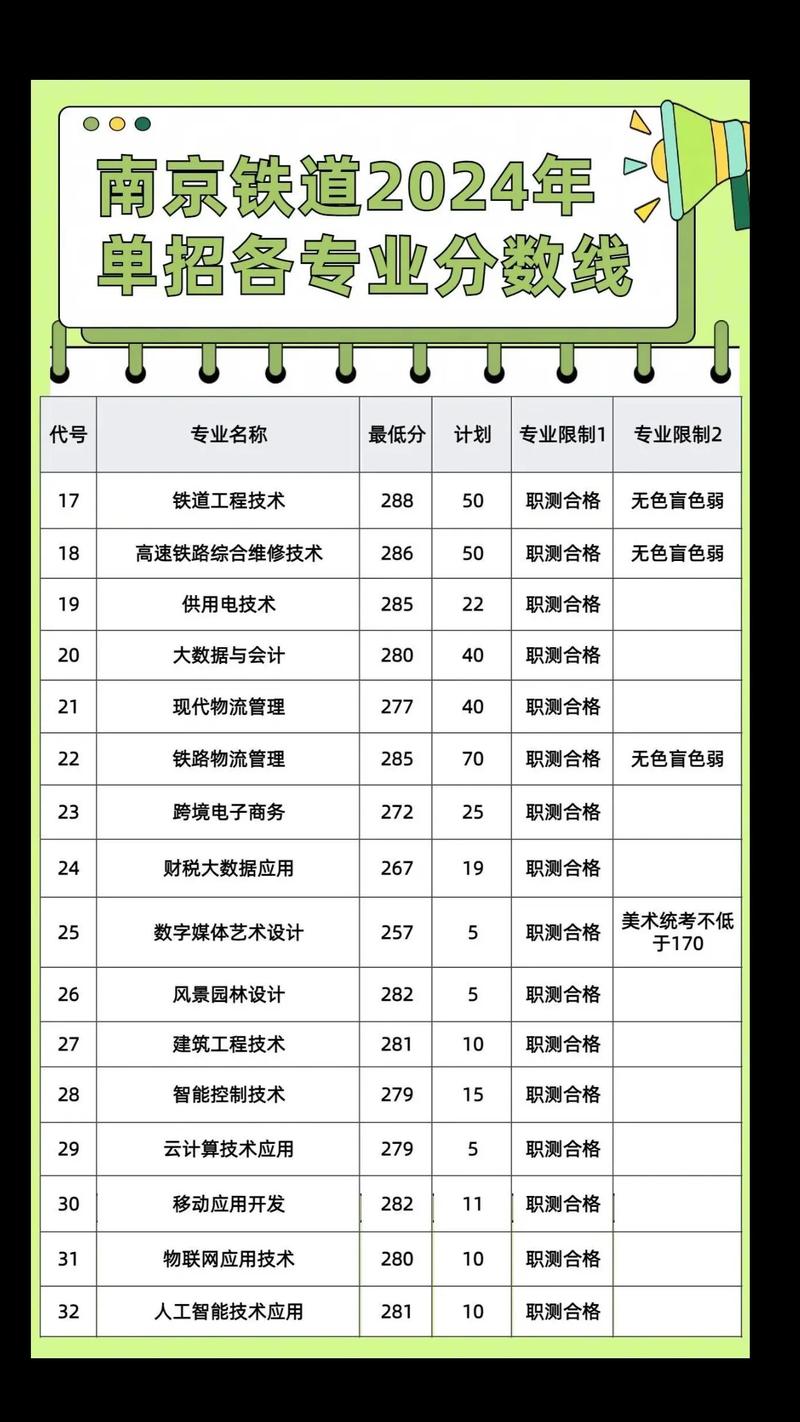 南京铁道职业技术学院(南铁)的单招分数线通常在300分以上,但具体分数会根据不同专业有所差异。例如,某些专业如会计(大数据与会计)的最低录取分数线可能仅需200分,而其他专业如物联网应用的分数线则相对较高。