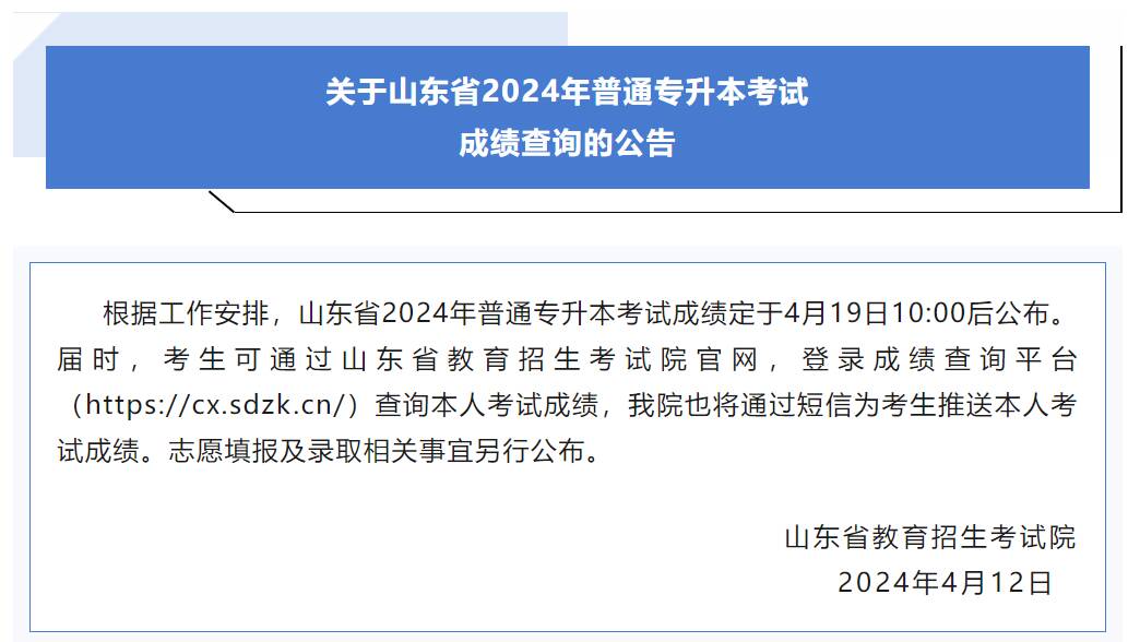 2024年山东省普通专升本考试成绩将于4月19日10:00后公布。考生可以通过山东省教育招生考试院官网登录成绩查询平台(https://cx.sdzk.cn/)查询本人考试成绩,考试院也会通过短信为考生推送本人考试成绩。