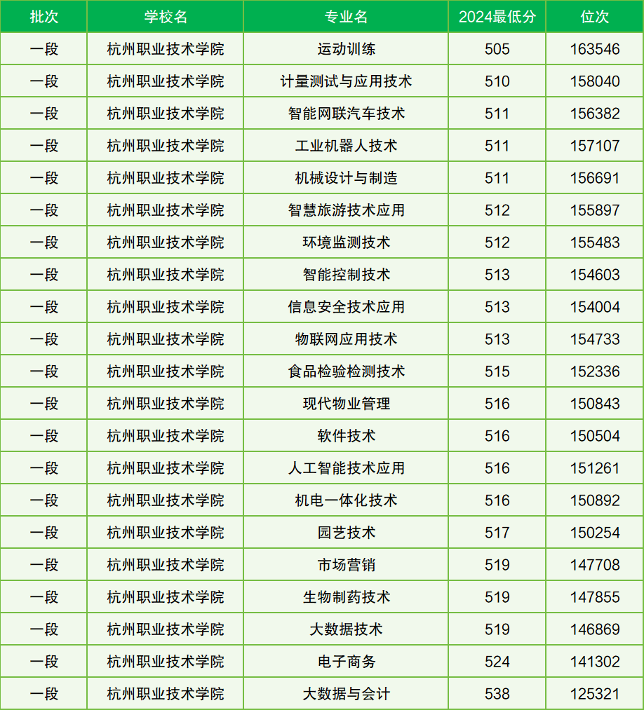 3. 2024年杭州大专大学录取分数线最低是390分,录取位次为252516名。杭州大专收分最低的学校是浙江长征职业技术学院。