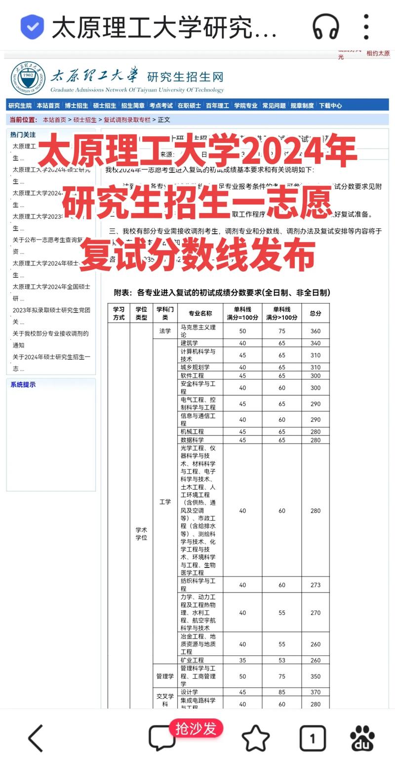– 太原理工大学2024年硕士研究生招生一志愿考生进入复试的初试成绩基本要求,包括不同学科门类、专业名称、单科线(满分=100分和满分>100分)以及总分要求。