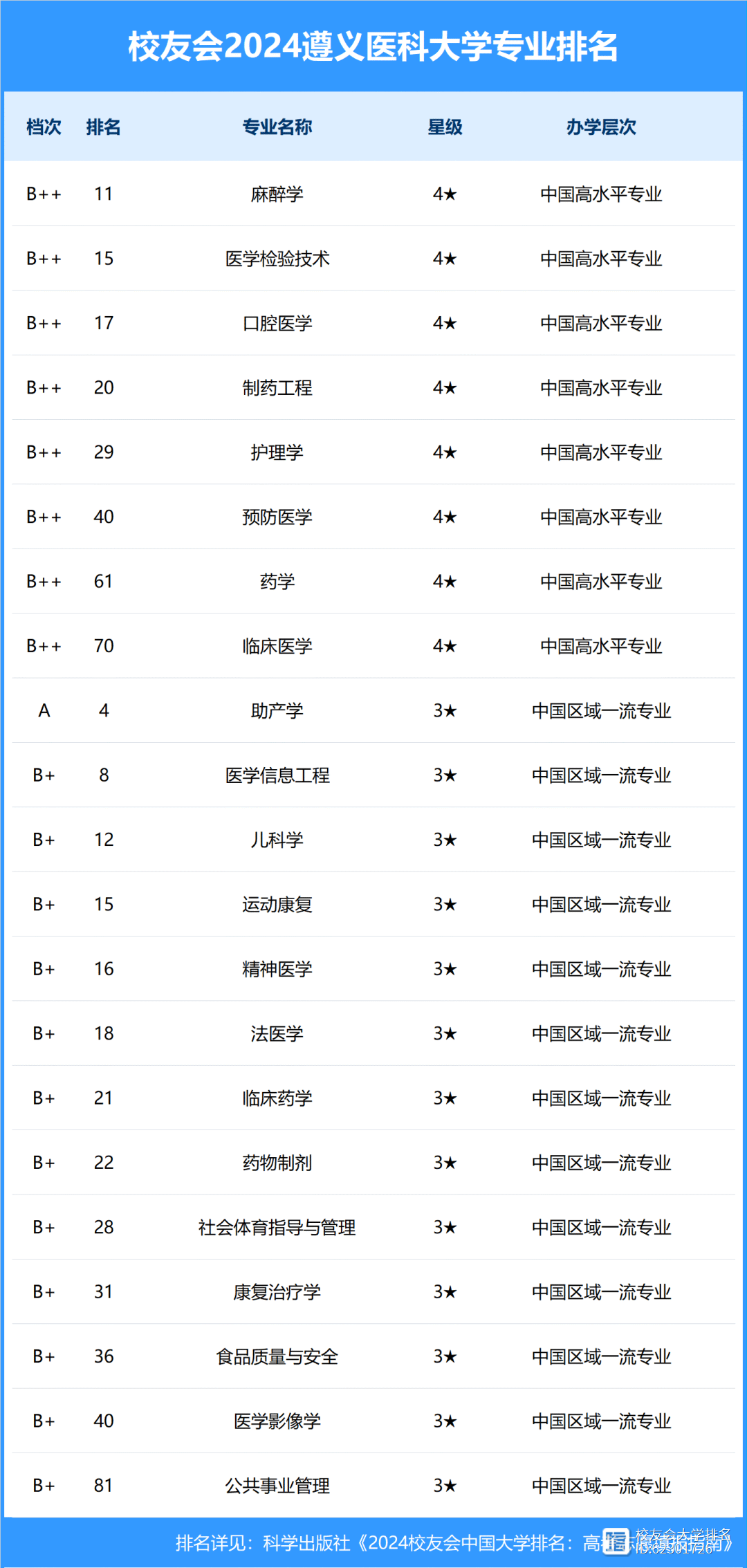 这些排名显示遵义医科大学在医药类院校中表现较好,且部分学科具有较高的评级。