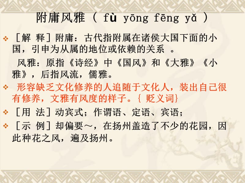 – 释义:根据《新华词典》的解释,“附庸风雅”指的是那些为了抬高自己的身份而假装懂得文化艺术的人,通常是官僚、商人等社会地位较高但文化修养不足的人。