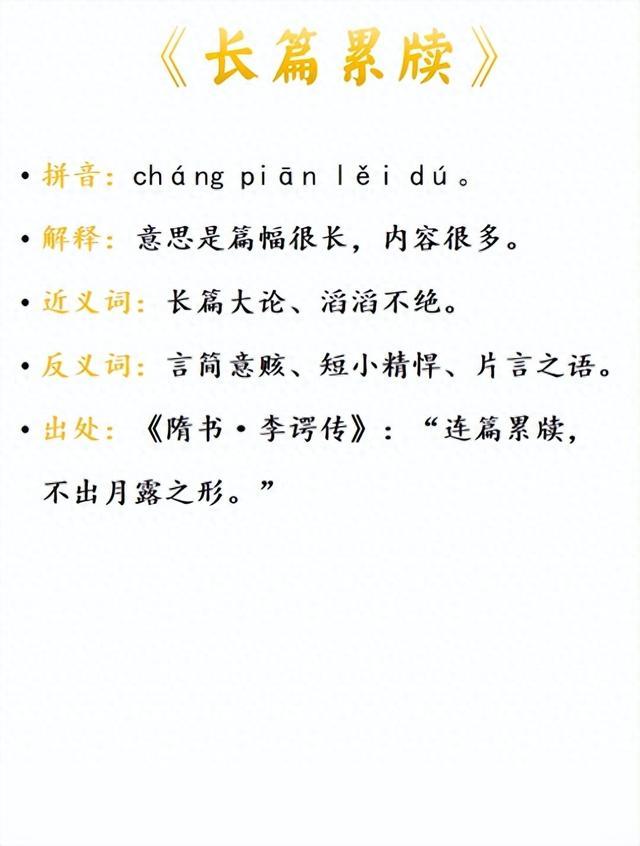 【成语意思】:长篇累牍:形容文章或文字篇幅很长,内容繁多,通常带有贬义。