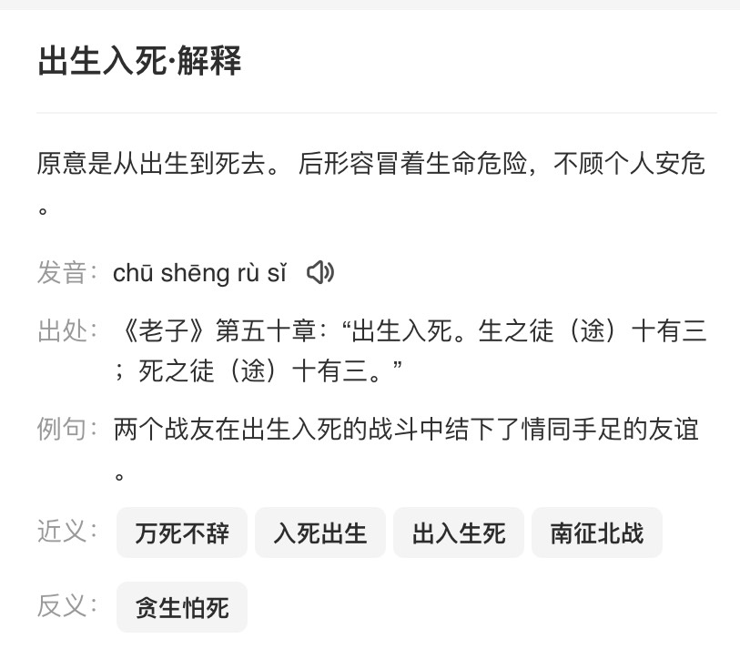 【入死出生的近义词】:出生入死、舍生忘死