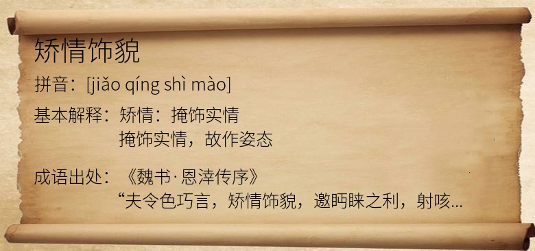 【成语意思】:矫情饰诈:以虚假的现象伪装欺骗别人。